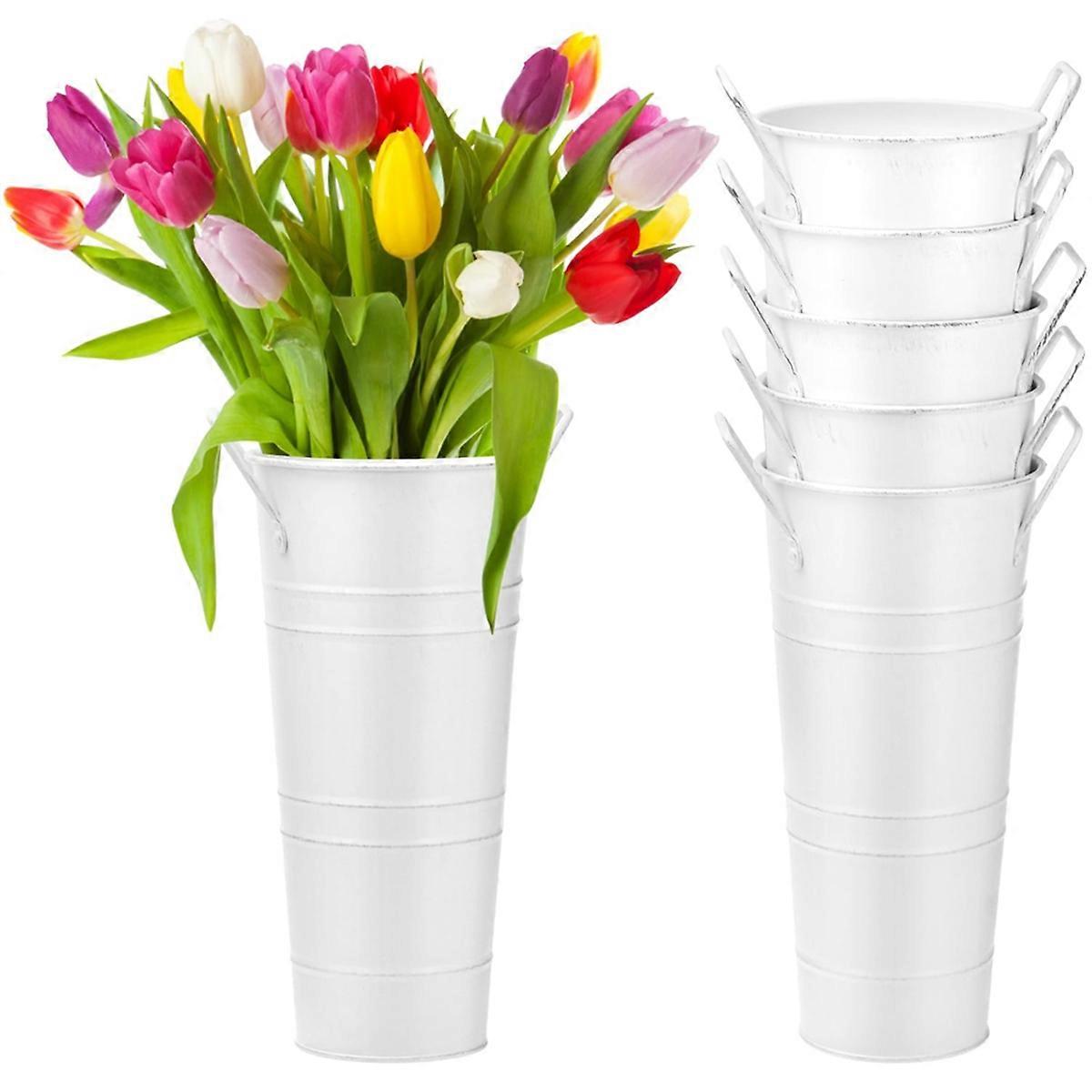 White Flower Buckets, 6 Pcs 9.8inch Tall Galvanized Metal Vases with Waterproof Coating, French Flower Bucket