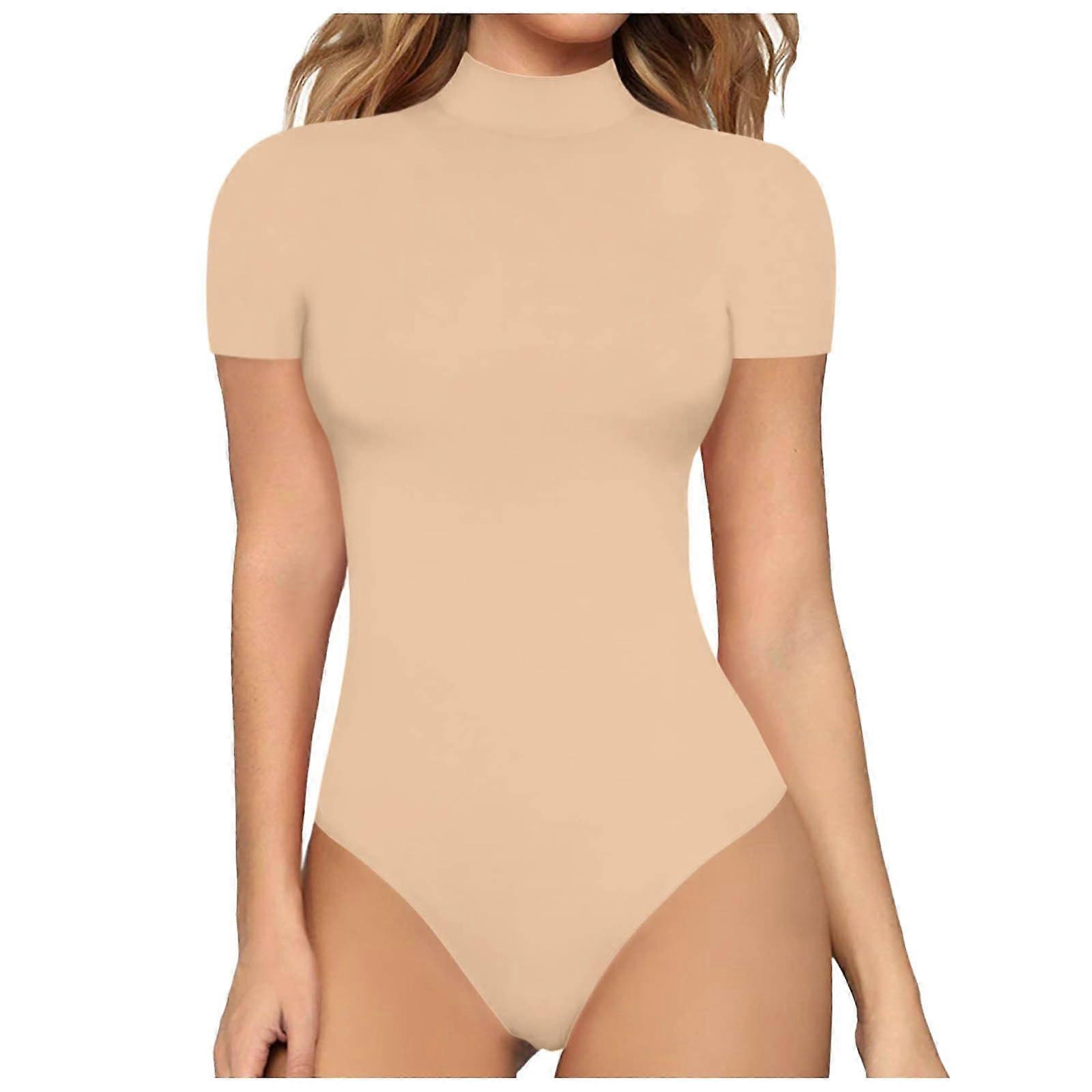 Women's Short Sleeve Bodysuit StandUp Collar Shapewear Thong Khaki Size S