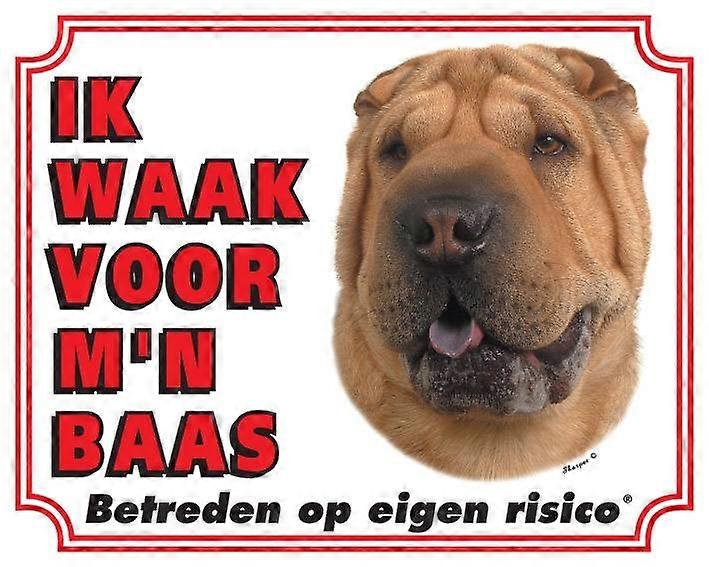 Ik waak voor mijn baas waakbord met afbeelding van de Shar Pei.Het waakbord is gemaakt van Polystreen.Afmetingen 25 x 20 x 0,1 cm. Laat onbevoegden weten met dit waakbord dat er een Shar Pei aanwezig is. Het bord heeft een witte achtergrond met een opdruk en is gemakkelijk te bevestigen door middel van de gaatjes aan de zijkanten.