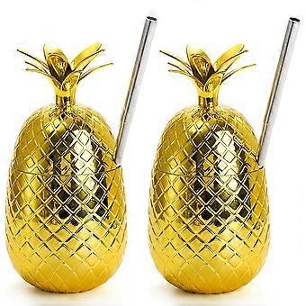 2 Pack Pineapples Drink Cups, 450Ml Gold Pineapples with Stretched Straw, Hawaiian Luau Party Cups
