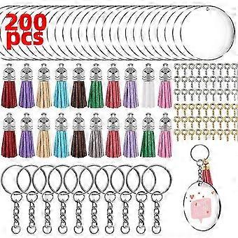 200 Pieces Clear Acrylic Round Keychain Discs Kit with Acrylic Circle Discs, Ring with Chain, Open Rings, Leather Tassels for DIY Keyring Jewelry Acce