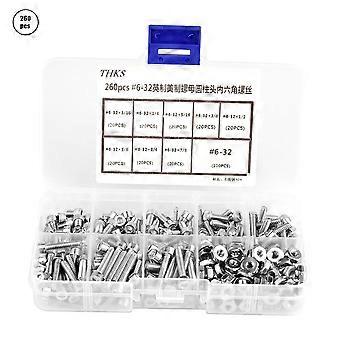 260pcs/set #6-32 Stainless Steel Hex Socket Cap Head Screws and Nuts Assortment