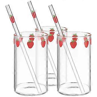 3 Sets Strawberry Glass Milk Cups with Straws – Reusable Juice Tumblers for Parties & Home Use – Easy to Clean Flat Bottom Design