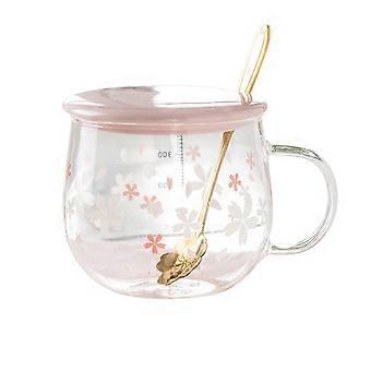400Ml Sakura Glass Coffee Mug Cute Transparent Heat-Resistant Water Cup with Handle Lid Spoon ,A