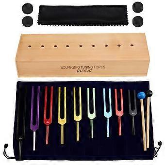 9pcs Colored Tuning Forks Set with Hammer and Wooden Box for Healing Meditation Yoga Relaxation Instrument
