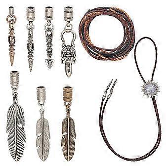 Bolo Tie Kit -- You receive 7pcs alloy cord end, size is about 5.2-8.1cm/2-3.2 inch long, inner diameter: 3.5-5mm, and 3meter/3.3yards Cowhide Leather Braided Rope, 1m/color, diameter about 4mm, great for men women to wear and show your style Premium Material -- Made of high quality alloy, the Bolo tie cord ends is strong and , not easy to break and deform, well made, not easily deformed and you for a long time Easy to Use -- Using these accessories you can easily make a lovely tie, the caveat is that the cover is a glue-on wire end, which is used by inserting a bead of glue into , then pressing the wire into Wide Applications -- Everyday casual office wear to party dinner outfit accessories can be easily matched. Suitable for Christmas, Valentine's Day, easter, anniversary, wedding, party, meeting and everyday wear Ideal Gift -- There is a retro and elegant pattern on cover of the tie, which is delicate and beautiful. Make a one-of-a-kind bolo tie with this kit and give it to your friends and family who love you and love it Colour:As Shown Material:Metal Package Contents: 1 set x bolo tie kit Only the above package content, other products are not included. Note: Light reflection and different displays may cause the color of the item in the picture a little different from the real thing. The measurement allowed error is +/- 1-3cm.