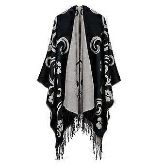 Cashmere Feel Thicken Poncho Fringed Hem Shawl Wrap with Flowers Open Front Long Winter Sweater Coat