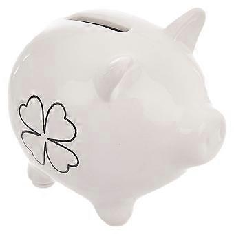 Ceramic piggy bank with clover motif, perfect for saving.