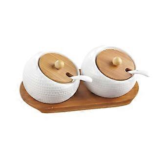 Ceramic Seasoning Jar Set, 2 Pieces with Bamboo Covers, 2 Ceramic Spoons, Wooden Pallet for Sugar a