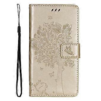 Case For Iphone 13 Mini Gold-embossed Cat And Butterfly Under The Tree Leather No7581