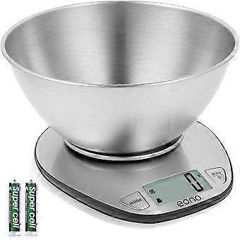 【PRECISE MEASUREMENTS】 Food scale with 4 new high precision sensors weighs up to 11lb/5kg graduation 0.1oz/1g,minimum weight recommendation 3g-5g.【EASY TO USE】 Fast tare function for easy compatibility with other containers; Easy units conversion between g,oz, ml and Ib:oz measurement; Backlight LCD display for visible readings.【THREE KINDS MODO】Digital kitchen scale can measures weight of dry ingredients and volume indication of liquids (water and milk).【SUPER BOWEL 】Detachable large stainless steel mixing bowl.Diameter 21 cm/ height 10 cm, with easy clean stainless steel body. HG