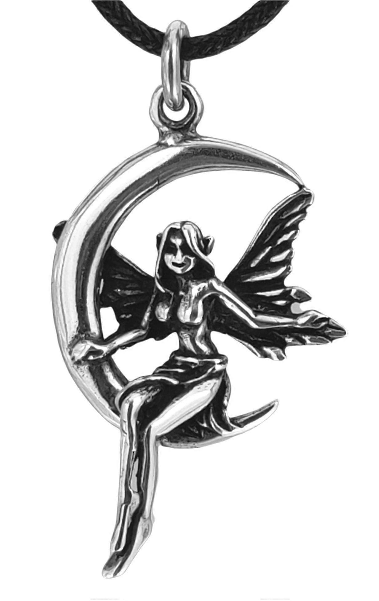 Massive, plastisch gearbeitete Mondelfe aus 925 Sterling Silber. Die Elfe hat spitze Ohren und große Flügel und sitzt grazil auf ihrer Mondsichel. Der Kettenanhänger ist teilweise geschwärzt, sodass die Details, wie etwa die Struktur der Flügel und der Haare, optimal zur Geltung kommen. Maße: ca. 36 mm hoch x ca. 23 mm breit Innendurchmesser der Öse: ca. 5,5 mm Gewicht: ca. 5,3 g Der Schmuckanhänger wird inklusive einer edlen Schlangenkette aus 925 Sterling Silber geliefert. Die Halskette ist ca. 1 mm dick und dezent oxidiert. Wir haben drei verschiedene Längen im Angebot: 45 cm, 55 cm und 65 cm.  Hintergrund: Elfen und Feen sind der Inbegriff von Zartheit und Eleganz. Die zauberhaften Wesen sind als Naturgeister vor allem in verwunschenen Wäldern zu finden.