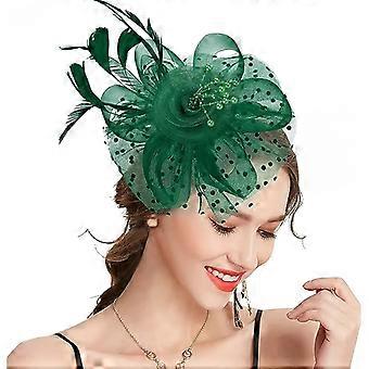 Green - Hat with flower and net ribbon, feather headband and tea clips, for girls and women.