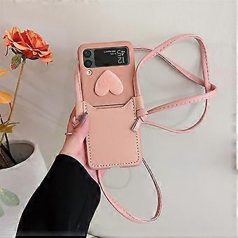 Love Heart Case Compatible With Samsung Galaxy Z Flip 4, Pc Frame& Pu Leather Shockproof Cover With Lanyard Pink