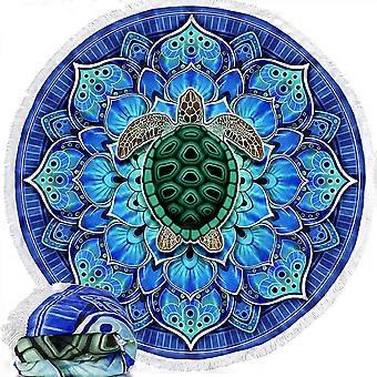 Microfibre Cotton Picnic Towel 59" x 59" , Circular Beach Blanket Throw with Fringe, Plush Round Tapestry, (Mandala Turtle)