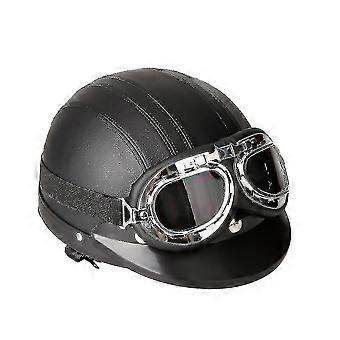 Motorcycle Scooter Open Face Half Leather Helmet With Visor Uv Goggles Retro Vintage Style 54-60cm