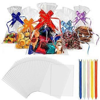 100Pcs Cellophane Bags, 6 x 10 In Cookie Bags with Colorful Pull Bows, Clear Gift Bags for Food Storage
