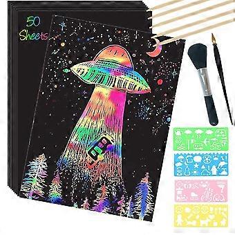 Scratch Paper Art Set,50 Sheets 8x11in Rainbow Coated Scratchboard Large Scratch Paper with Wooden Styluses and Stencils