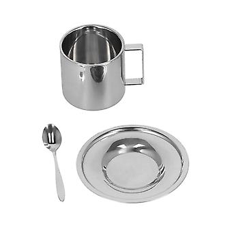 Set of 3 Double Wall Stainless Steel Insulated Coffee Mugs Milk Tea Cups with Saucer and Spoon (280ml)