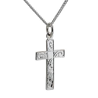 Silver 24x14mm hand engraved flat latin Cross with a curb Chain 24 inches