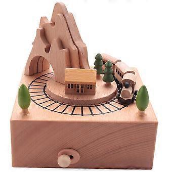 Wooden Musical Box Featuring Mountain Tunnel With Small Moving Magnetic Train Plays